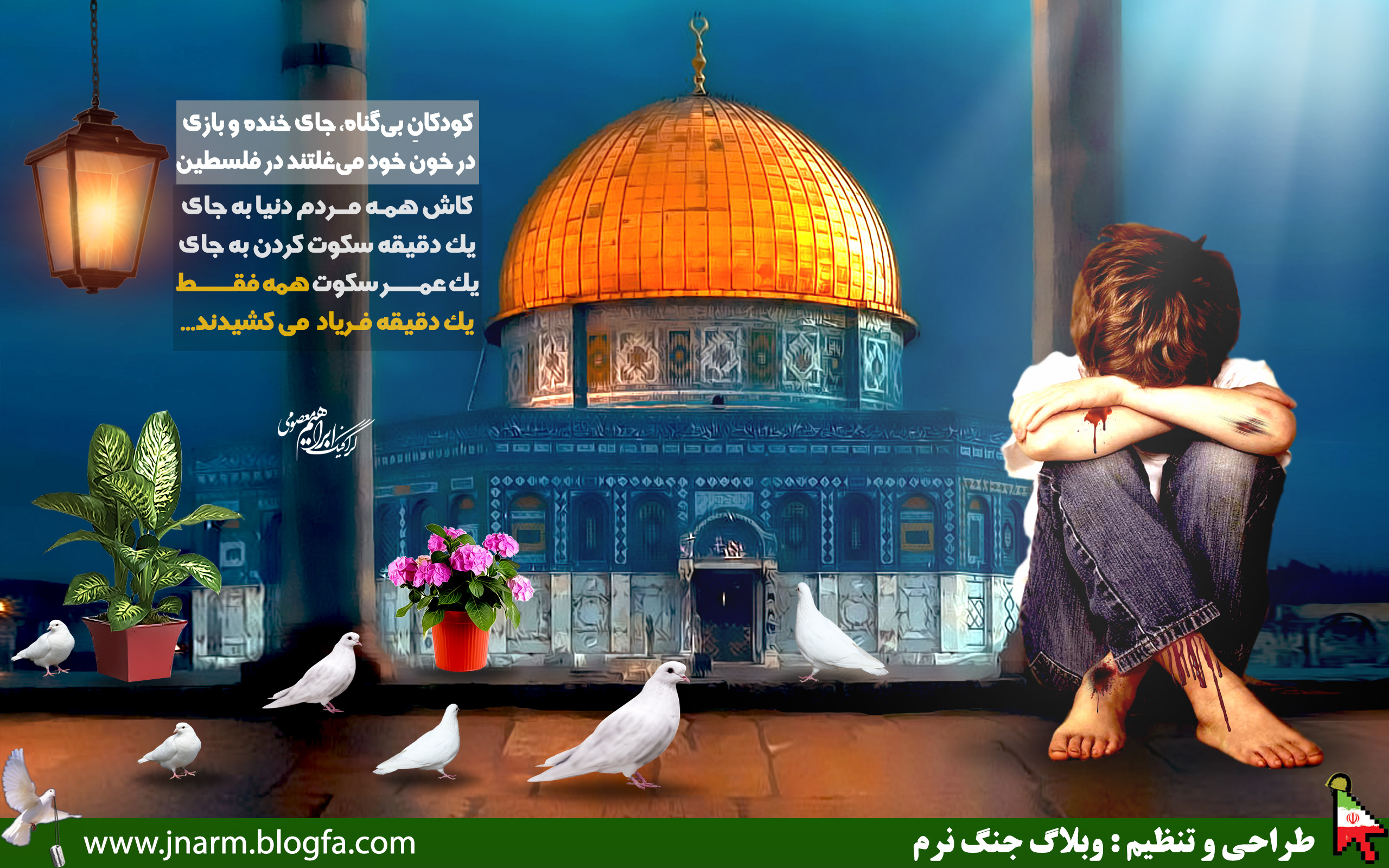 من را تماشا نکنید من کودک فلسطینیام آرزوهایم را در بمب و گلوله گم کردهام باران خمپاره، مسلسل، نارنجک و مین خون ما هر روز جاری در زمین، من را تماشا نکنید من کودک فلسطینیام برادرانم در سنگر جنگ و نبرد ،خودم سنگربان خانه و وطن، وطنم اشغال است خانهام ویران است اما به زودی آن را با همین دستان کوچک آزاد خواهم ساخت من کودک فلسطینیام من را فقط تماشا نکنید...!