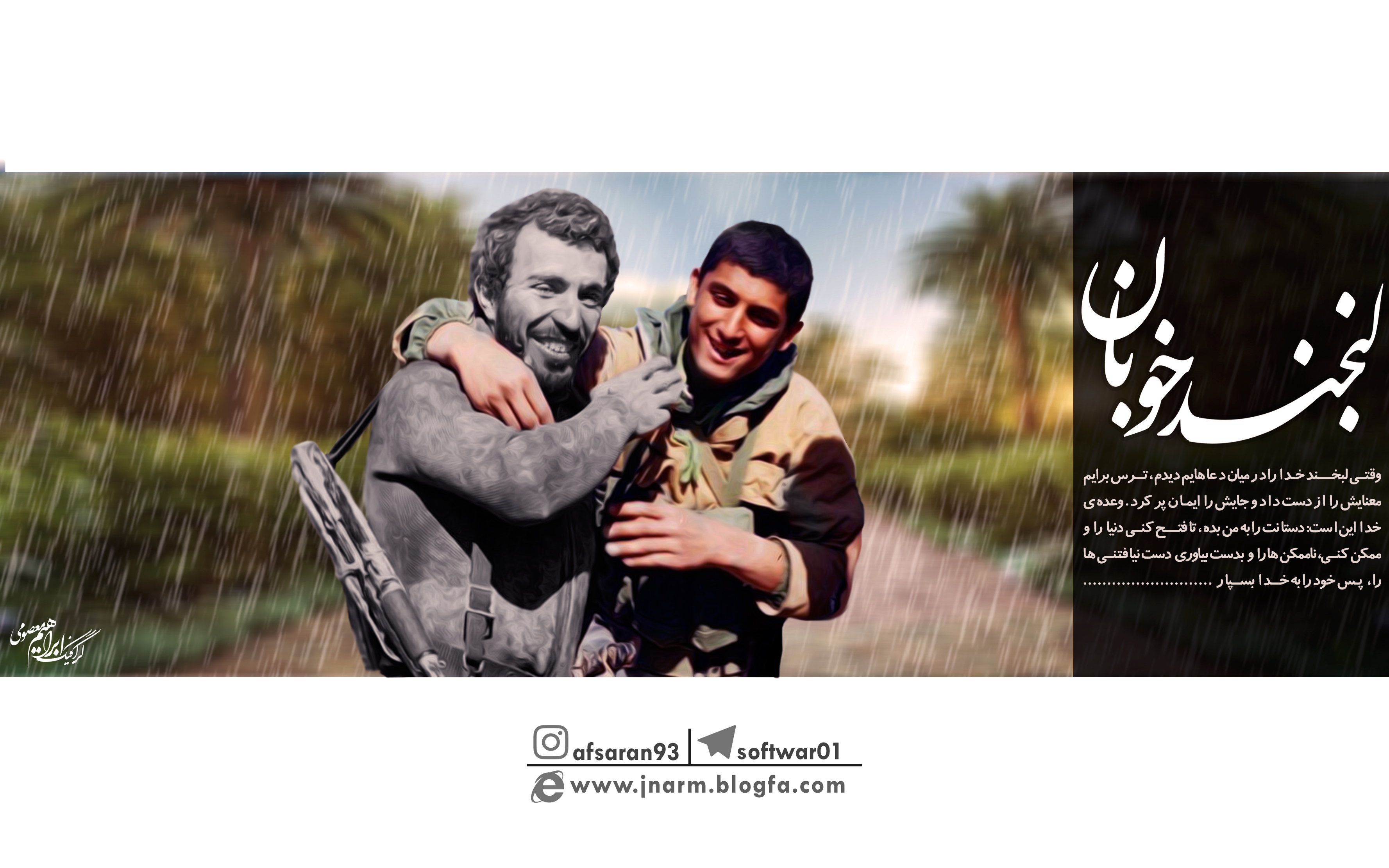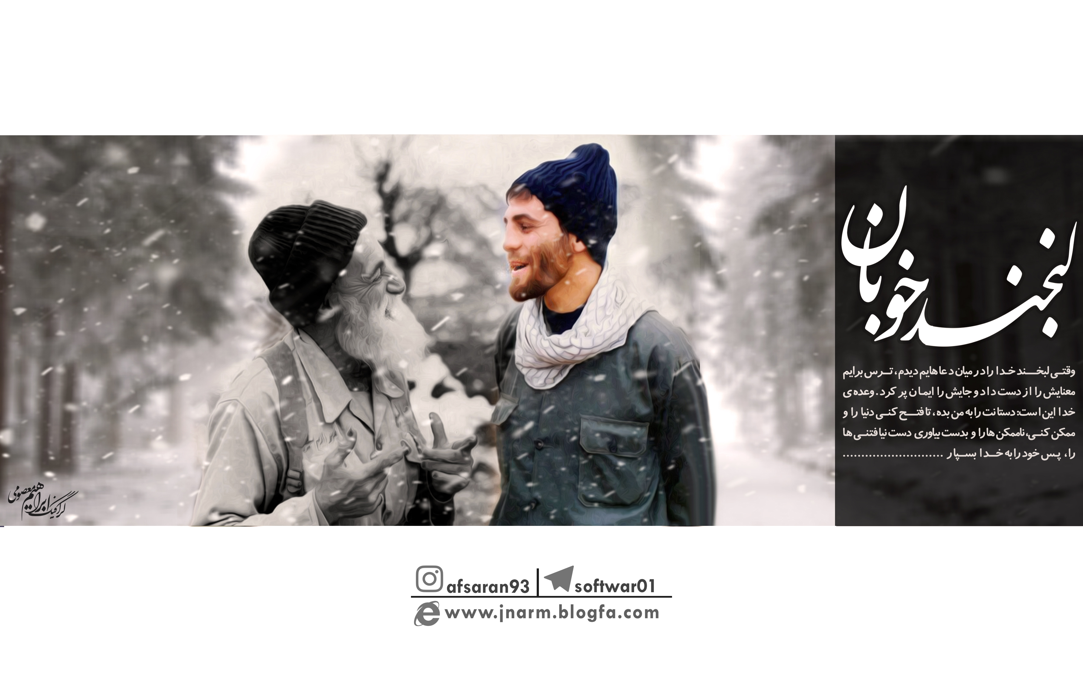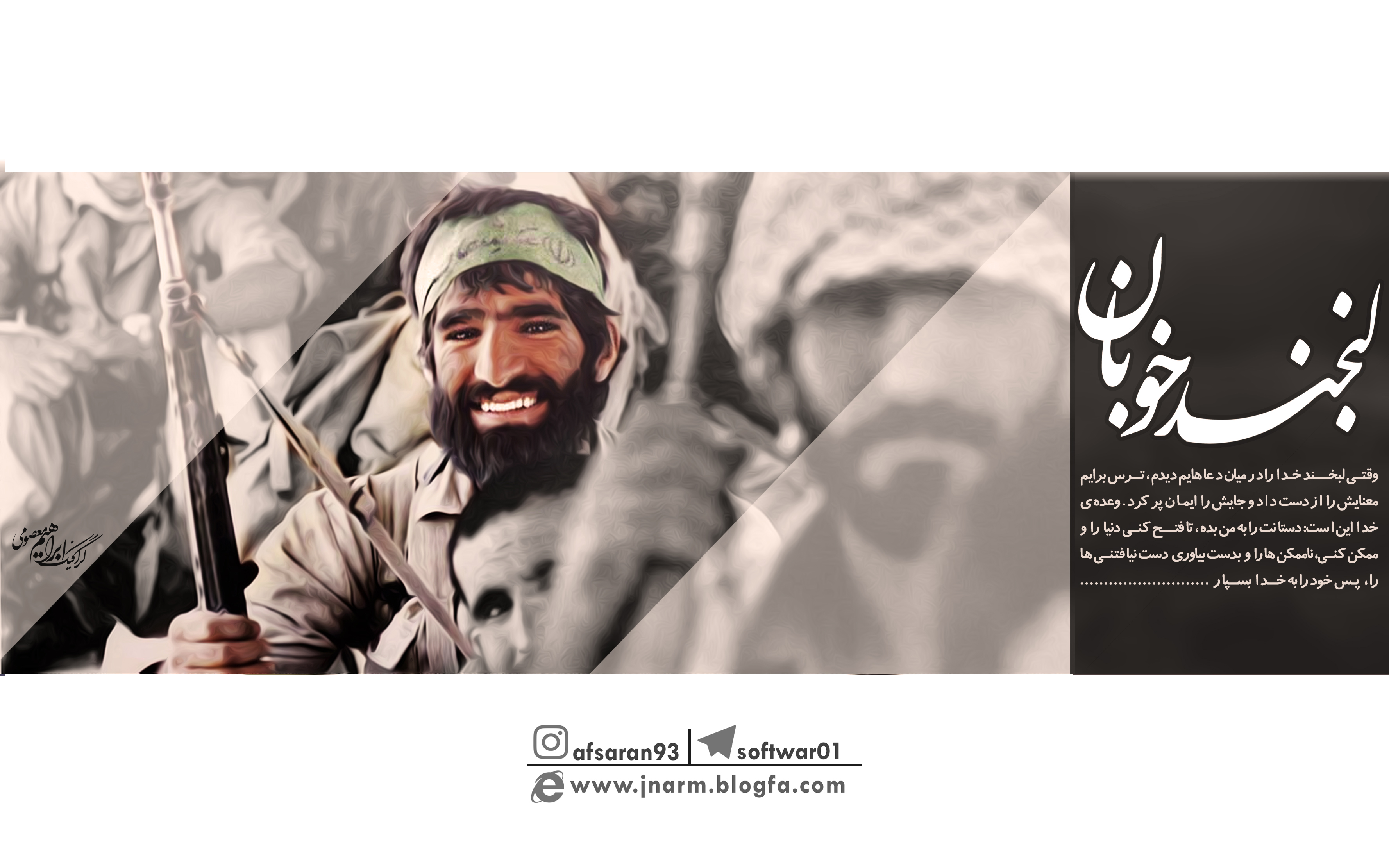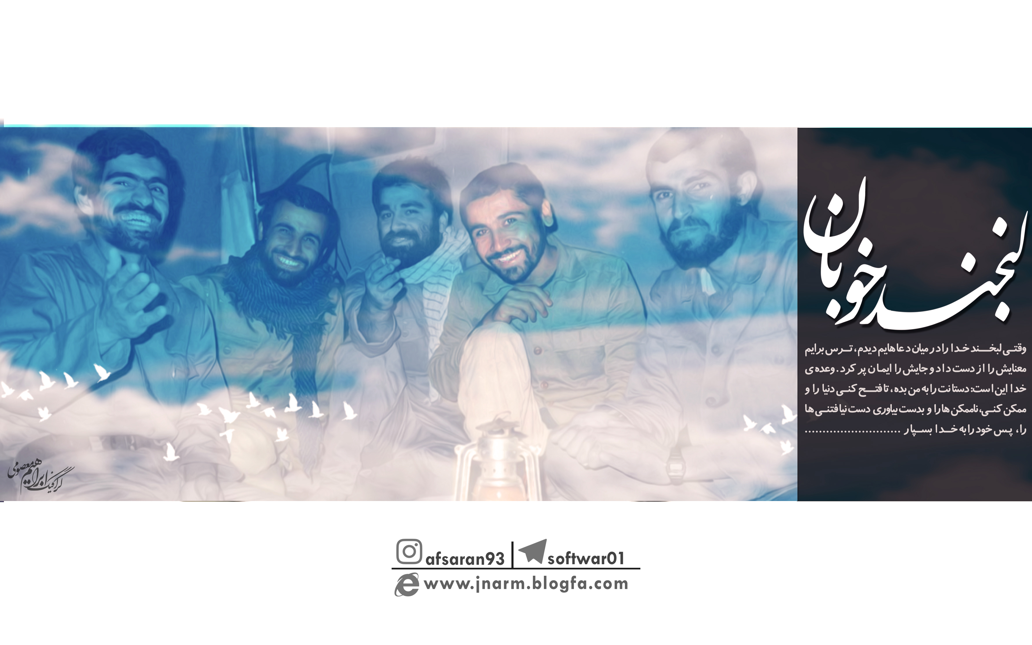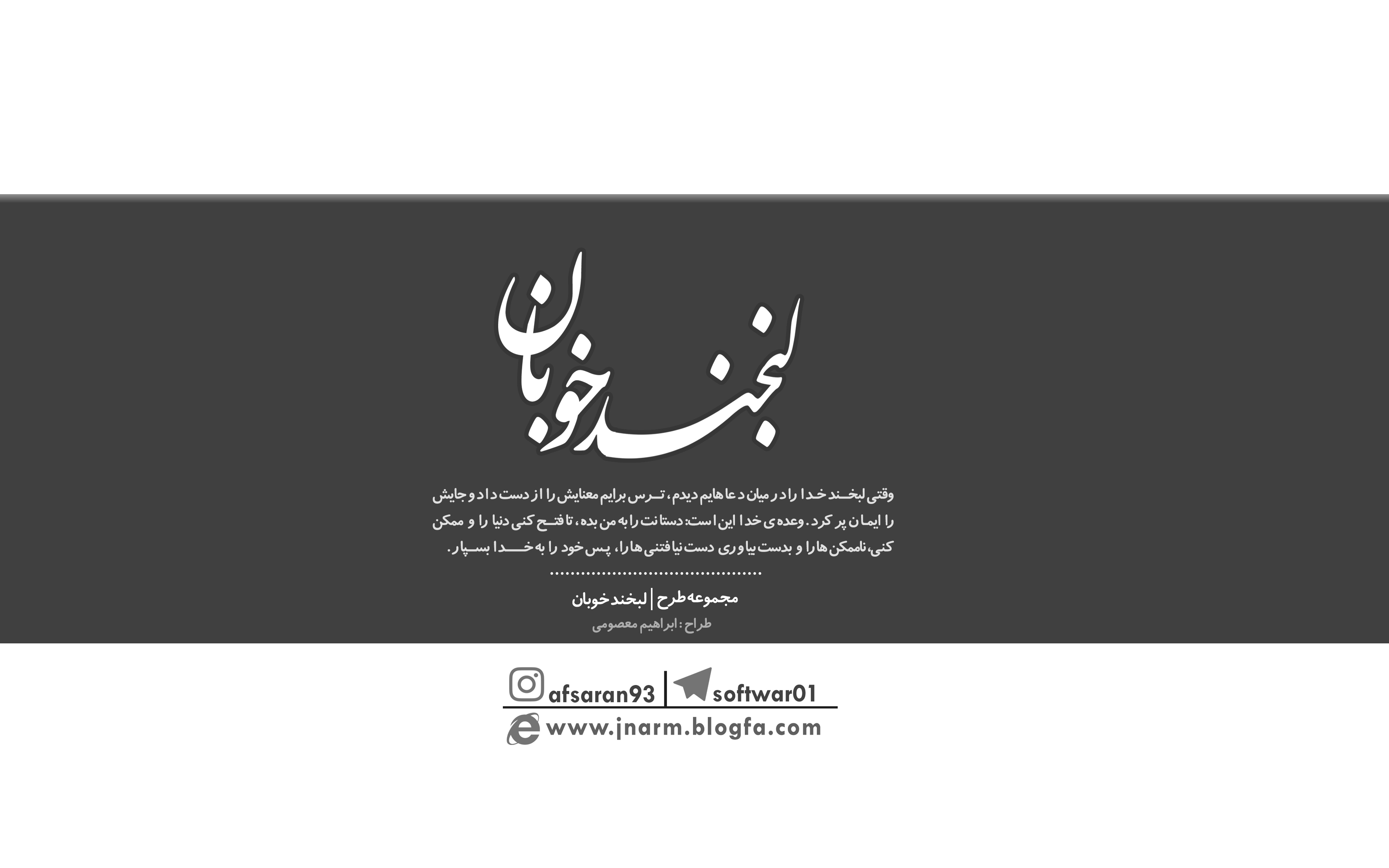 وقتی ﻟﺒﺨﻨﺪ ﺧﺪﺍ ﺭﺍ ﺩﺭ ﻣﻴﺎﻥ ﺩﻋﺎﻫﺎﻳﻢ ﺩﻳﺪﻡ، "ﺗﺮﺱ" ﺑﺮﺍﻳﻢ ﻣﻌﻨﺎﻳﺶ ﺭﺍ ﺍﺯ ﺩﺳﺖ ﺩﺍﺩ ﻭ ﺟﺎﻳﺶ ﺭﺍ " ﺍﻳﻤﺎﻥ" ﭘﺮ ﻛﺮﺩ. ﻭﻋﺪﻩ ی ﺧﺪﺍ ﺍﻳﻦ ﺍﺳﺖ: ﺩﺳﺘﺎﻧﺖ ﺭﺍ ﺑﻪ ﻣﻦ ﺑﺪﻩ، ﺗﺎ ﻓﺘﺢ کنی ﺩﻧﻴﺎ ﺭﺍ ﻭ ﻣﻤﻜﻦ کنی، ﻧﺎﻣﻤﻜﻦ ﻫﺎ ﺭﺍ ﻭ ﺑﺪﺳﺖ ﺑﻴﺎﻭﺭی دﺳﺖ ﻧﻴﺎفتنی ها ﺭﺍ، ﭘﺲ ﺧﻮﺩ ﺭﺍ ﺑﻪ ﺧﺪﺍ ﺑﺴﭙﺎﺭ....
