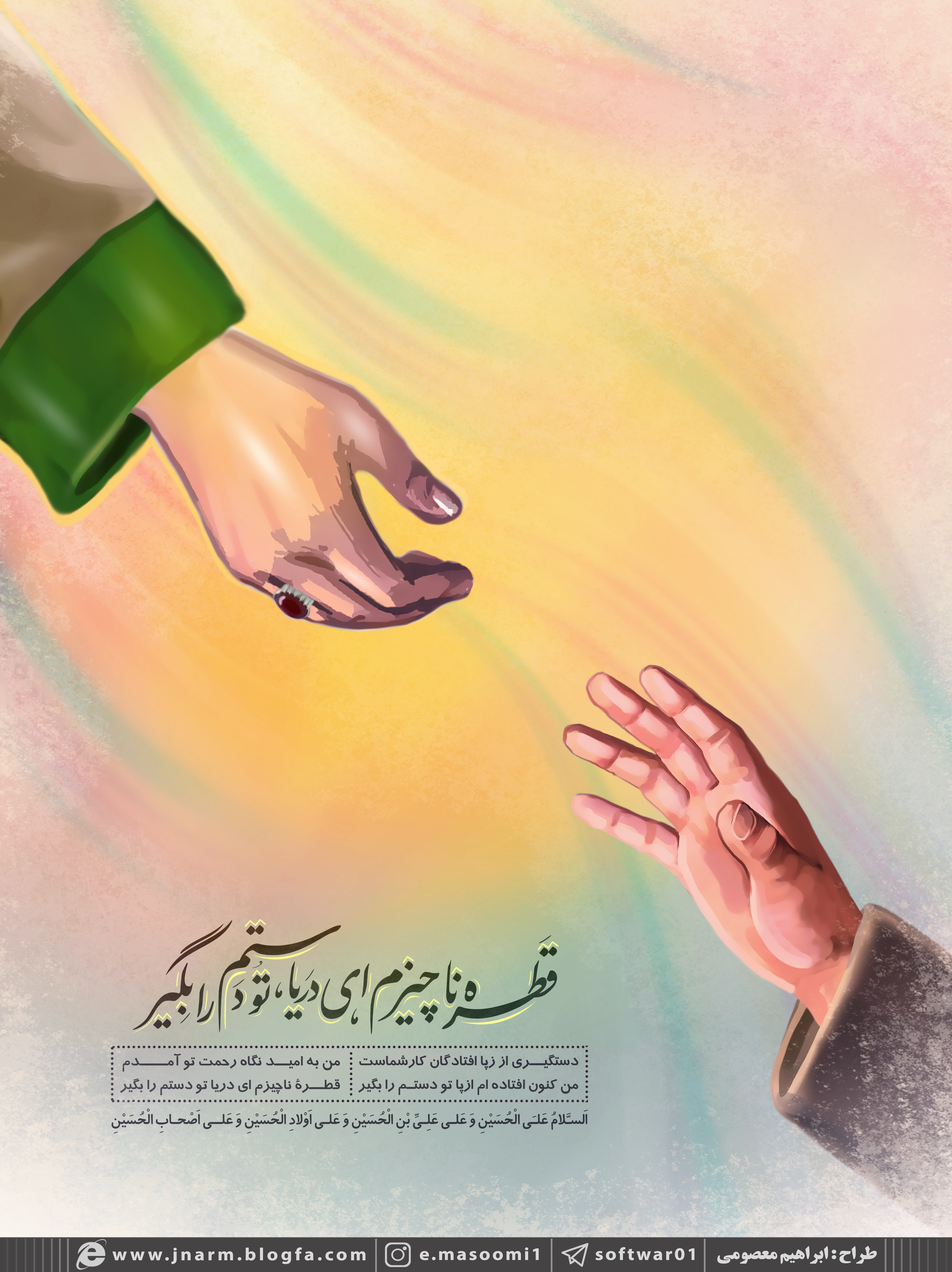 مُحرم این کعبۀ ایمان وعزّت گشته ام، شسته ام دست ازهمه دنیا تو دستم را بگیر، نیست جزتو بهر من امروز مصباح الهدا..،ای چراغ روشن فردا تو دستم را بگیر، بهترین ره تا خدا رفتن ره مهرشماست، ای حبیب ربی الاعلی تو دستم را بگیر، دوست دارم تاکنم جان را نثار راه تو، درفضای گرم عاشورا تو دستم را بگیر، عبد تو شدحُر وفائی تاکه عبد حُر شود، جان حُر ای مهربان مولا تو دستم را بگیر، / سید هاشم وفائی